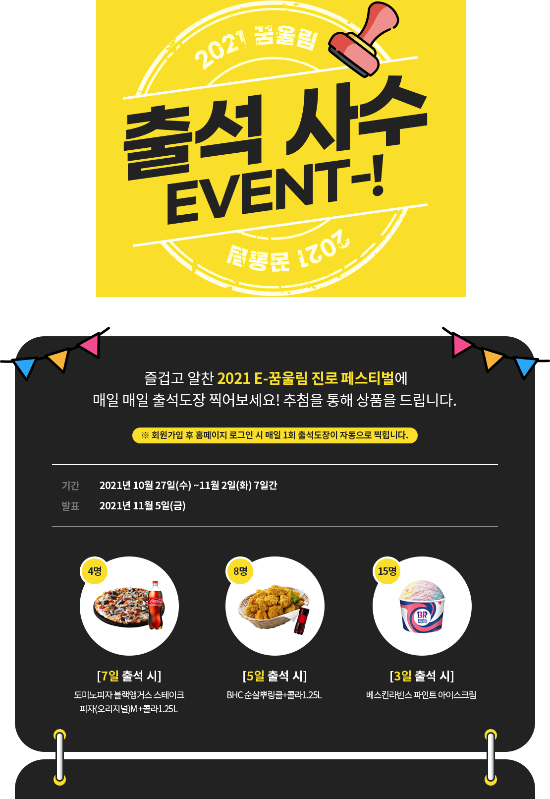 - 회원가입 후 홈페이지 로그인 시 매일 1회 출석도장이 자동으로 찍힙니다.
